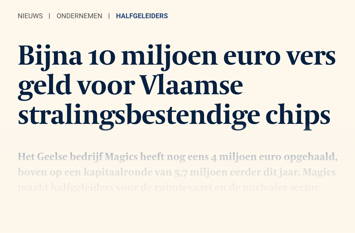 Magics has successfully completed the second closing of its capital round, raising an additional €4 million and bringing the total round to €9.7 million. The investment supports Magics’ continued expansion as a European leader in radiation-tolerant semiconductor technologies, developed in standard CMOS.